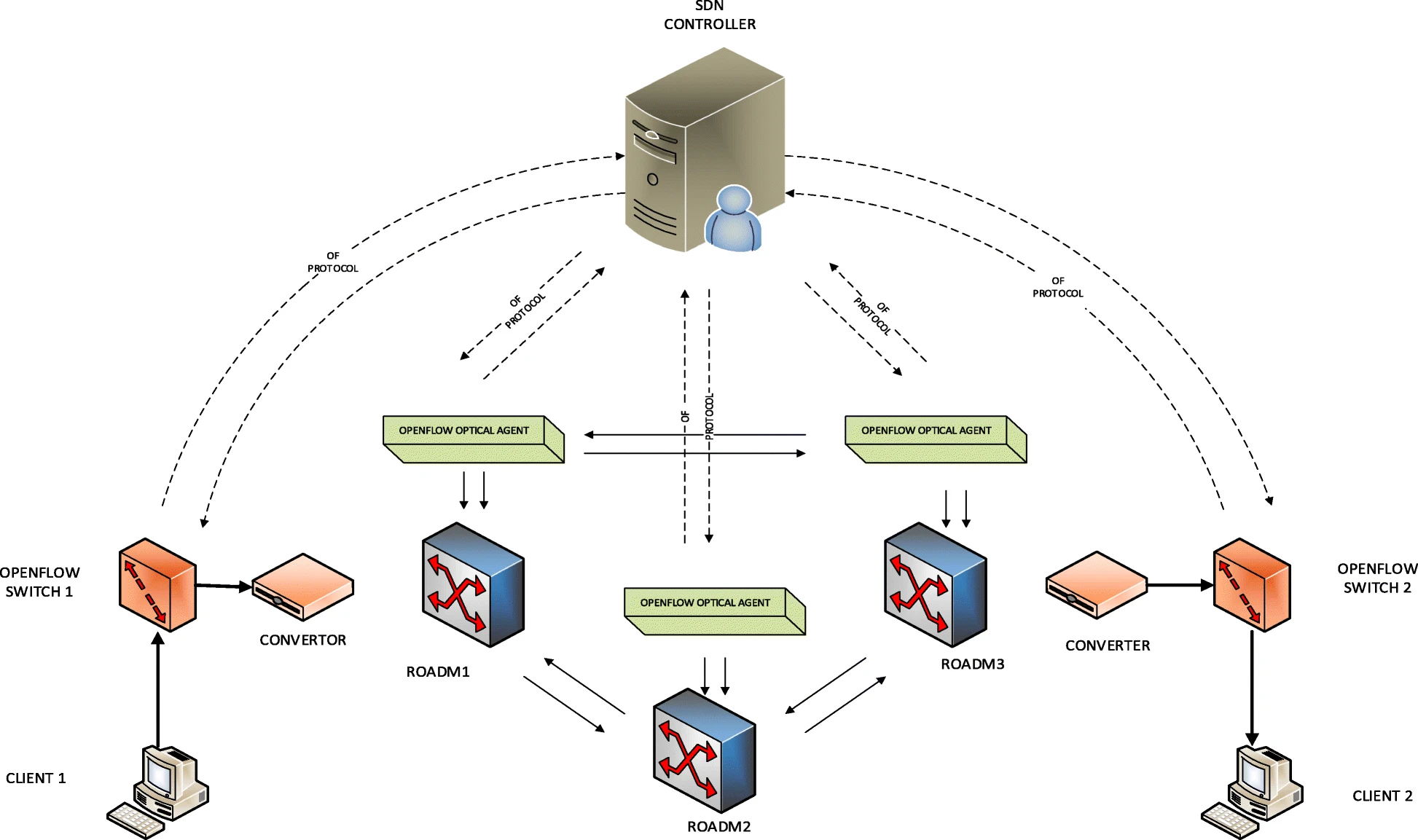 - Open S(oftware)-D(efined) N(etwork): The specialists use different open protocols like OpenFlow to operate the movements of the real and digital switches at the ground level.